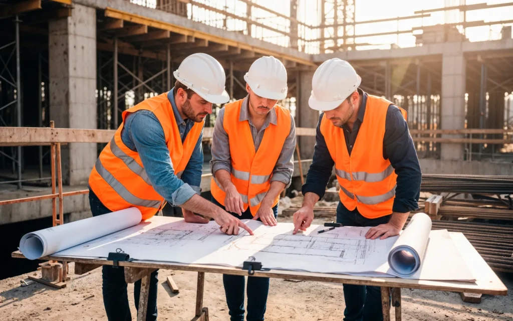 فريق مهندسين يراجع المخططات أثناء التنفيذ